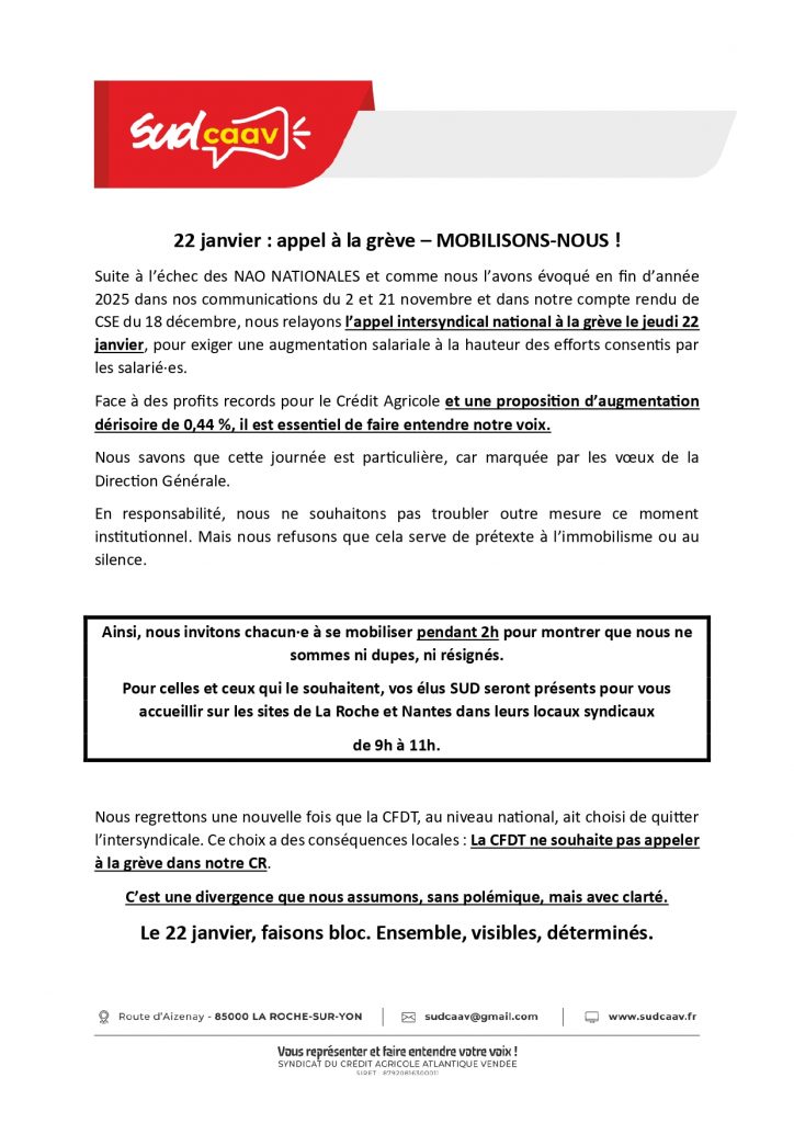 Dans le cadre de l’appel national à la grève du 22 janvier dans l’ensemble des caisses régionales suite à l’échec des NAO, nous vous avons consultés sur l’opportunité de relayer cet appel dans notre CR.