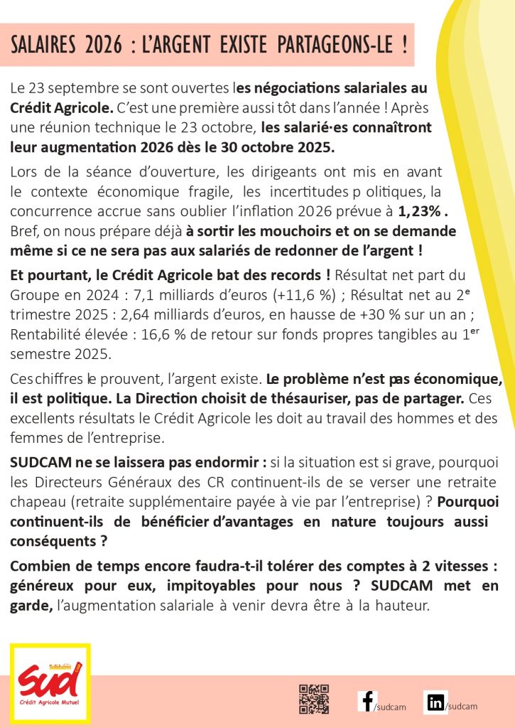 Il est temps de faire monter la pression car les négociations salariales démarrent tôt cette année au Crédit Agricole… et déjà, la Direction brandit les incertitudes économiques comme un écran de fumée. Pourtant, les chiffres sont là : des milliards de bénéfices, une rentabilité record… mais toujours pas de juste partage.