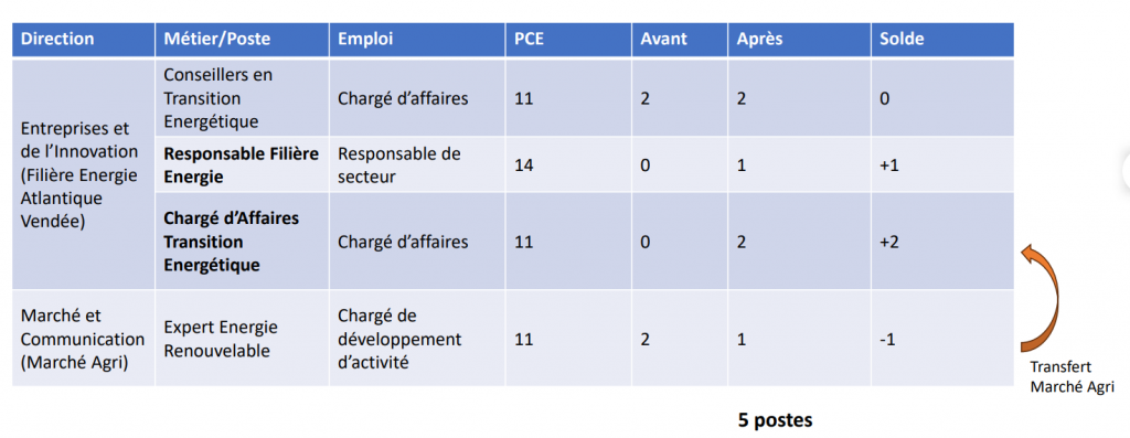 Concrètement, cela passera par le fusion des agences Habitat en une structure unique avec deux bases de vie (Nantes et La Roche-sur-Yon). La création d’un poste de Directeur d’Agence Habitat (PCE 13) et d’un Superviseur (PCE 11) une suppression de 1 poste de conseiller prescription et 1 poste E-Immo et le transfert progressif du savoir-faire vers le réseau de proximité, qui prendra en charge les RDV clients.